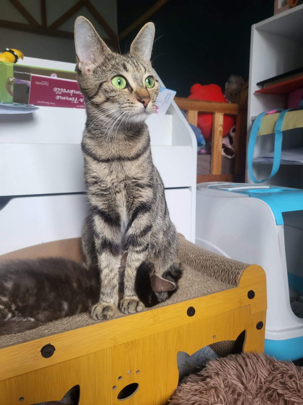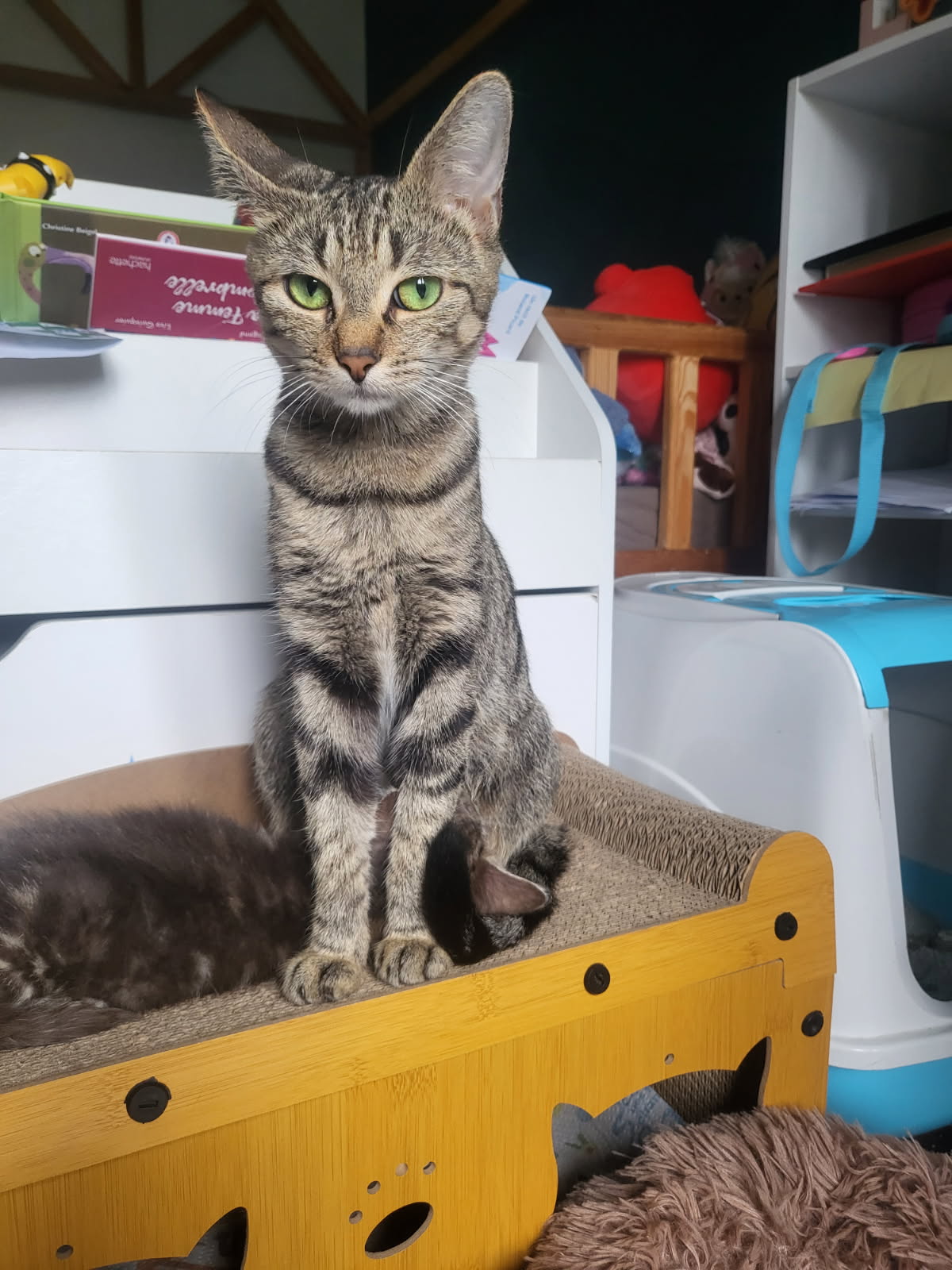 Cléa est une jolie et gentille minette tigrée de moins d’1 an ! très sympa, très câline et s’entend avec ses congénères ! Adorable tout simplement !
