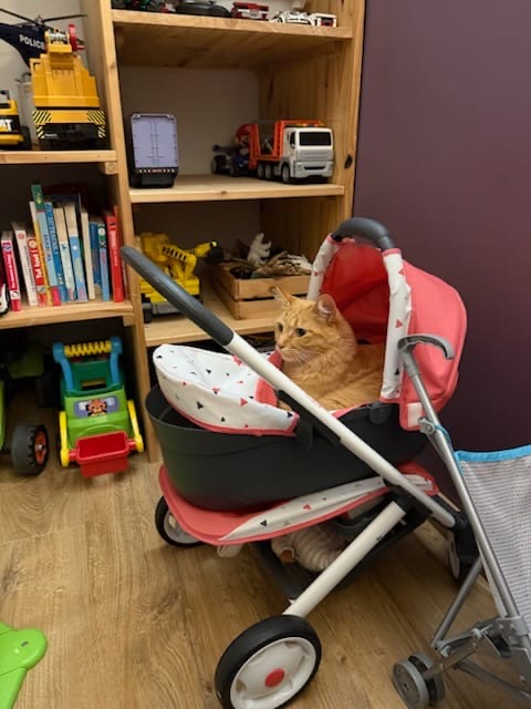 Il est extrêmement câlin, s’entend très bien avec les enfants même en bas âge mais n’aime pas ses congénères ! il lui faut un foyer avec un extérieur